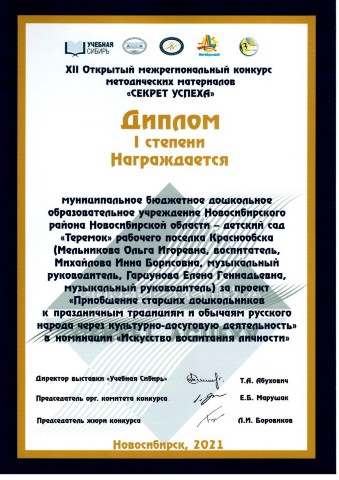 Открытый межрегиональный конкурс методических материалов "Секрет успеха" Диплом I степени, 2021 г. |