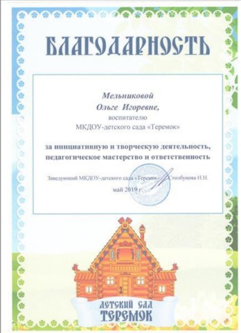 Благодарность ДОУ за инициативную и творческую деятельность, педагогическое мастерство и ответственность, 2019 г. |