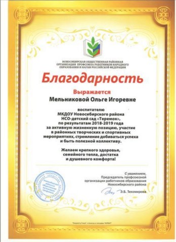 Благодарность Новосибирского районного профсоюза, 2019 г. |