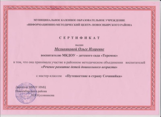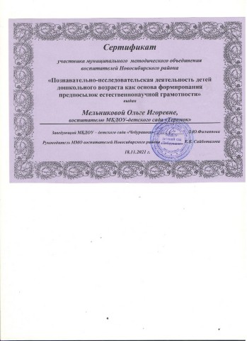 Сертификат участника муниципального методического объединения воспитателей Новосибирского района "Познавательно-исследовательская деятельность детей дошкольного возраста как основа формирования предпосылок естественнонаучной грамотности", 2021 |