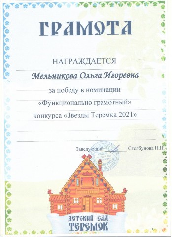 Конкурс "Звёзды Теремка" победитель в номинации "Функционально грамотный", 2021 г. |