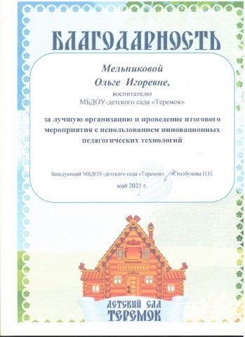 Благодарность ДОУ за лучшую организацию и проведение итогового мероприятия, 2021 г. |