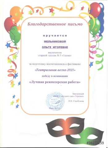 Благодарность ДОУ "Театральная весна-2021" за победу в номаниции "Лучшая режиссёрская работа" |