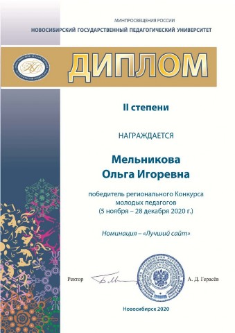 Диплом II степени НГПУ Регионального конкурса молодых педагогов, 2020г. |