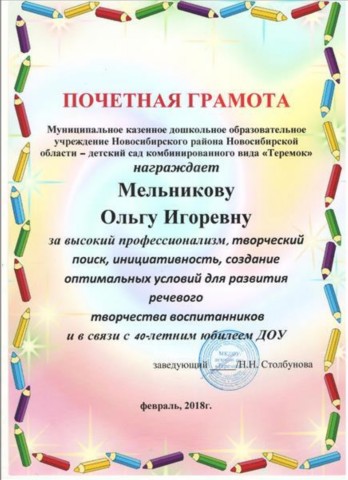 Почётная грамота ДОУ в связи с 40-летием, 2018 г. |