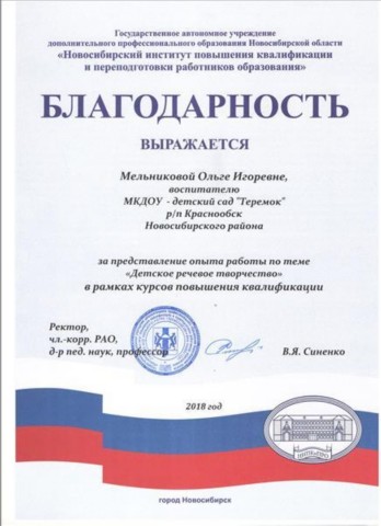Благодарность НИИкПРО за предоставление опыта в рамках курсов повышения квалификации, 2018 г. |