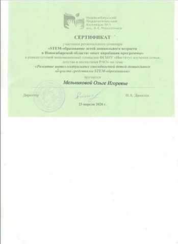 Сертификат участника регионального семинара "STEM-образование детей дошкольного возраста", 2020 г. |