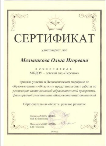 Сертификат участия в педагогическом марафоне: речевое развитие, 2018 г. |