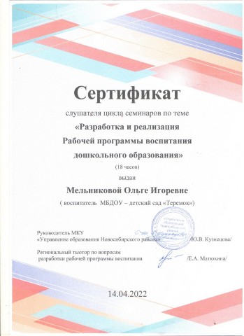 Сертификат "Разработка и реализация Рабочей программы воспитания дошкольного образования 2022" |