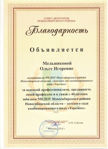 Благодарность Совета Депутатов Новосибирского района, февраль, 2018 г. |
