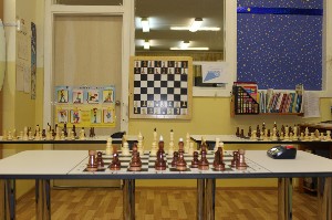 Уголок «Юный шахматист»: настенные магнитные доски, шахматные столы, наборы шахмат.